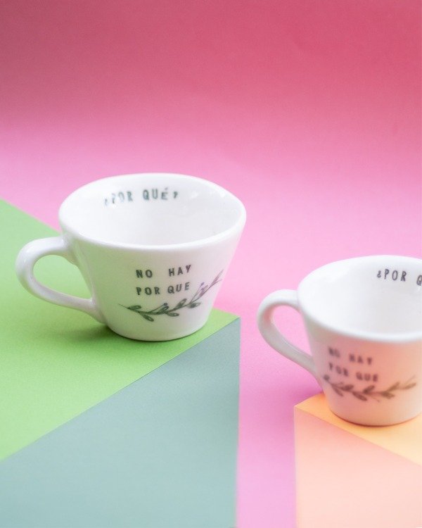 Tazas cónicas con frases en bajo relieve. Capacidad: 400cc